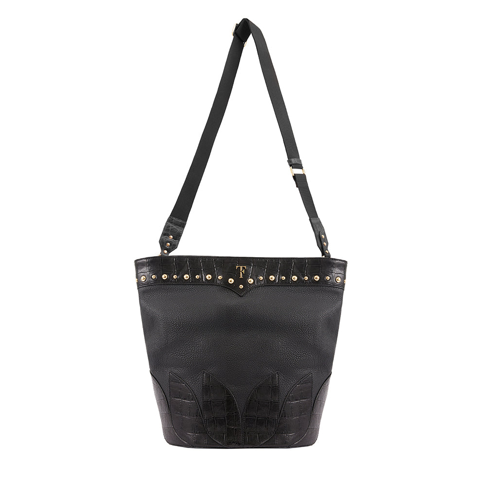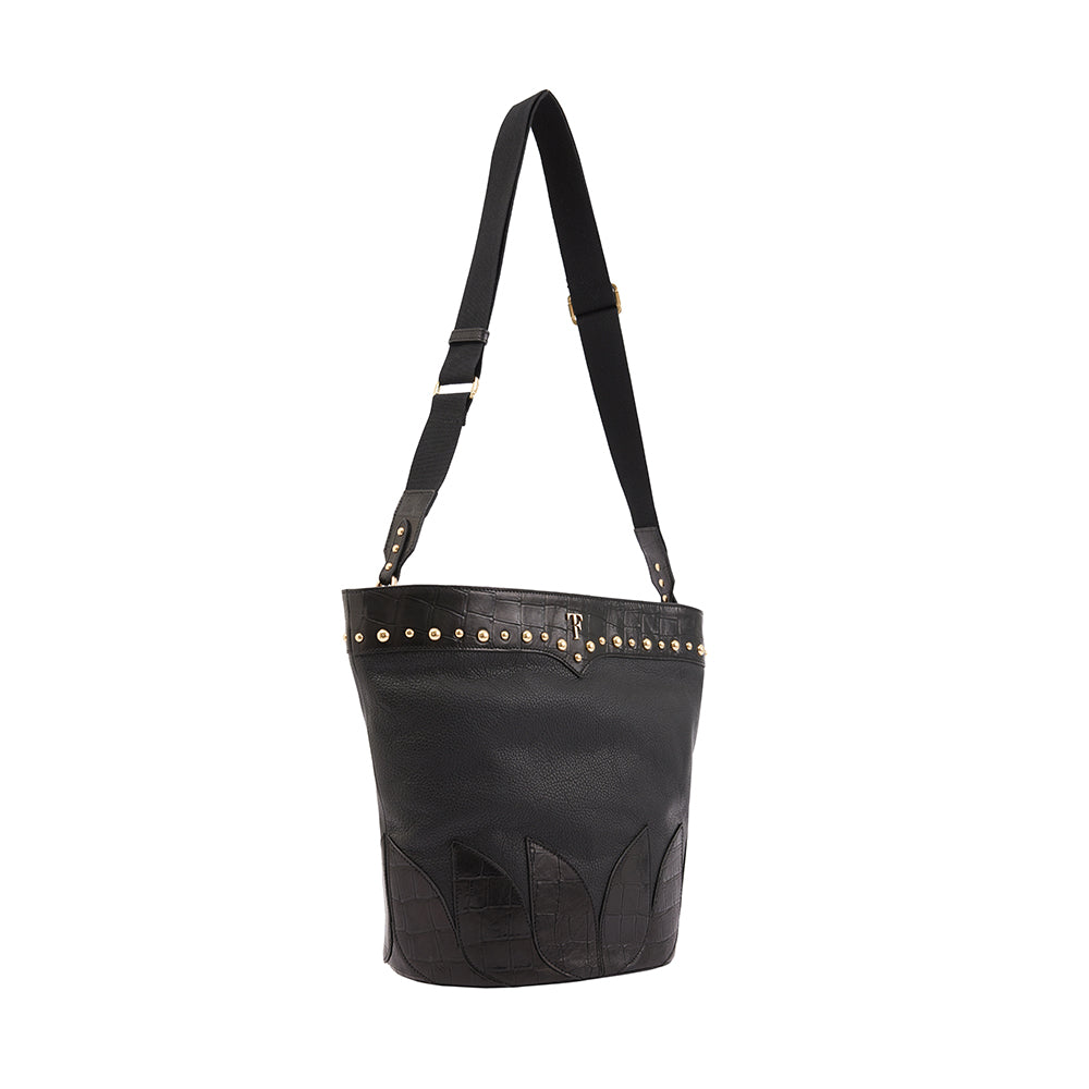 Handcrafted from soft calf leather, this classy and spacious bag framed with croc-embossed leather tulip shapes and decorated with golden studs around the TF logo. With its blend of elegance and practical style, it’s no wonder trendsetters have it at the top of their must-have list!