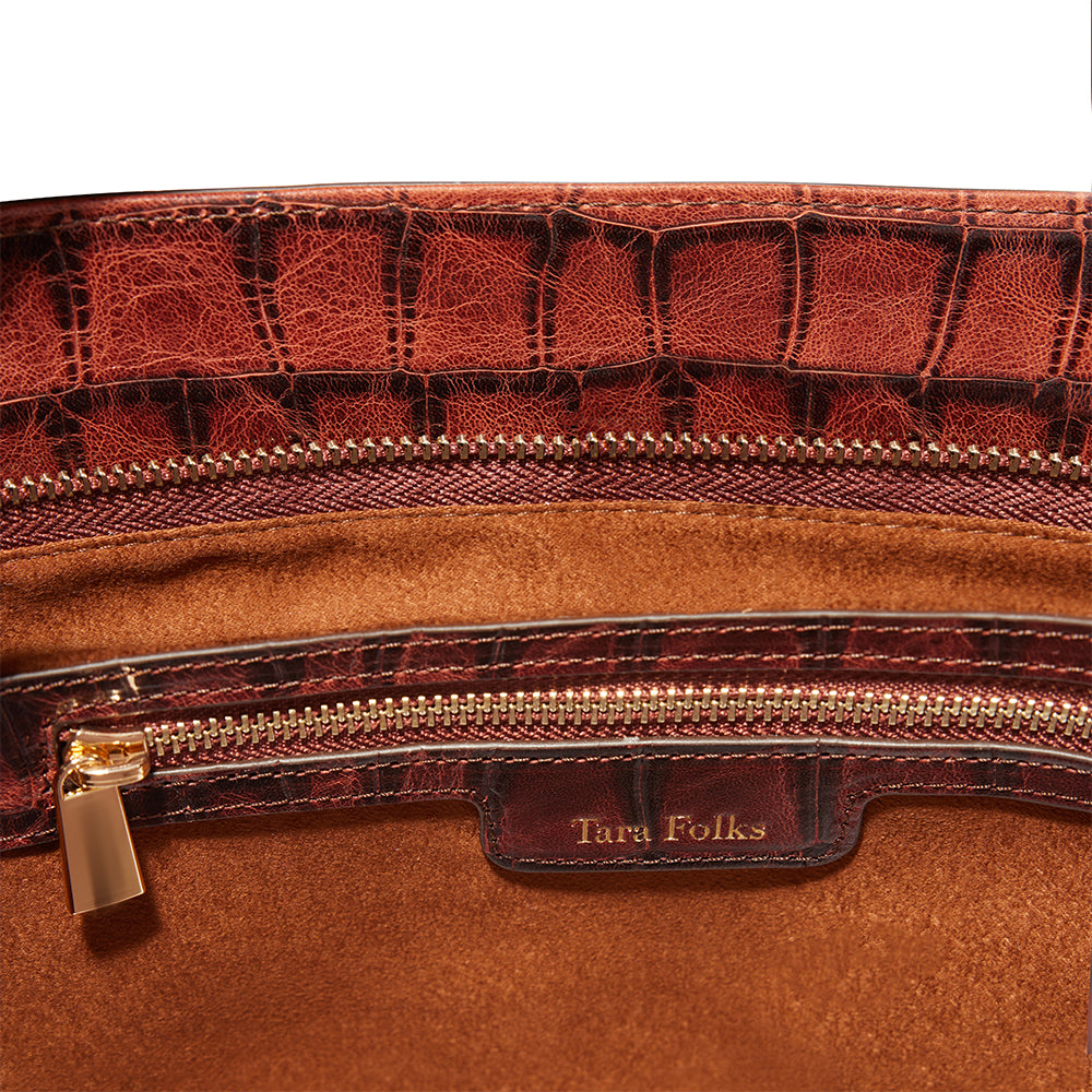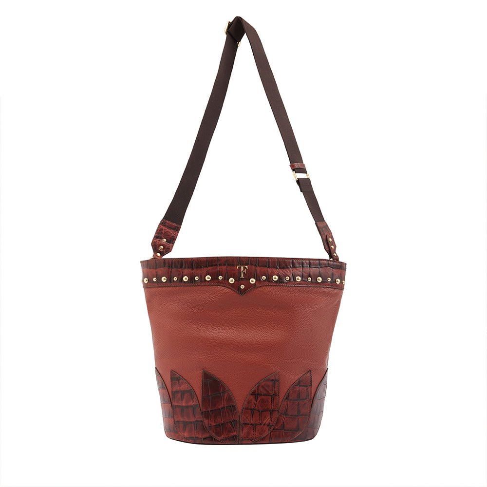 Handcrafted from soft calf leather, this classy and spacious bag framed with croc-embossed leather tulip shapes and decorated with golden studs around the TF logo. With its blend of elegance and practical style, it’s no wonder trendsetters have it at the top of their must-have list!
