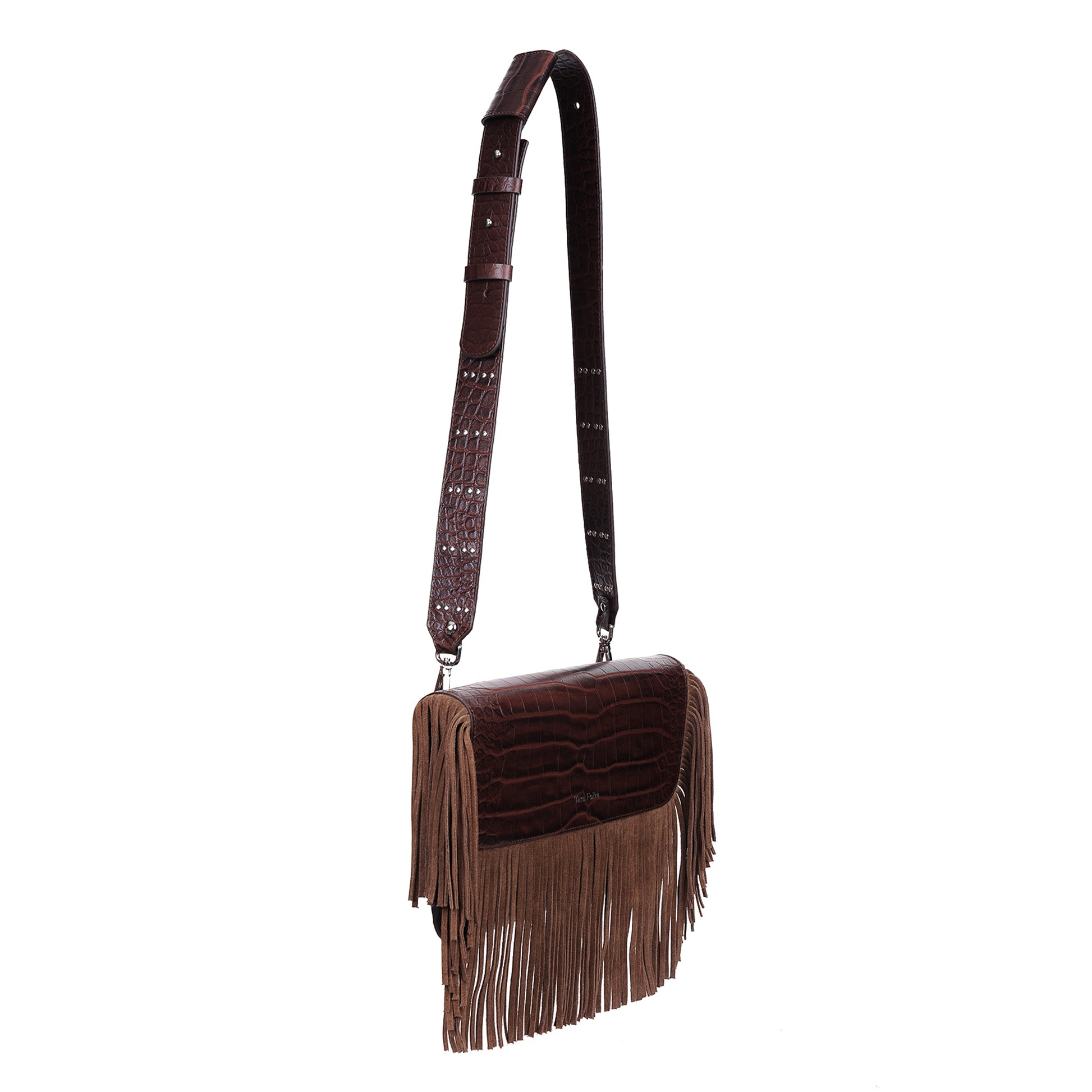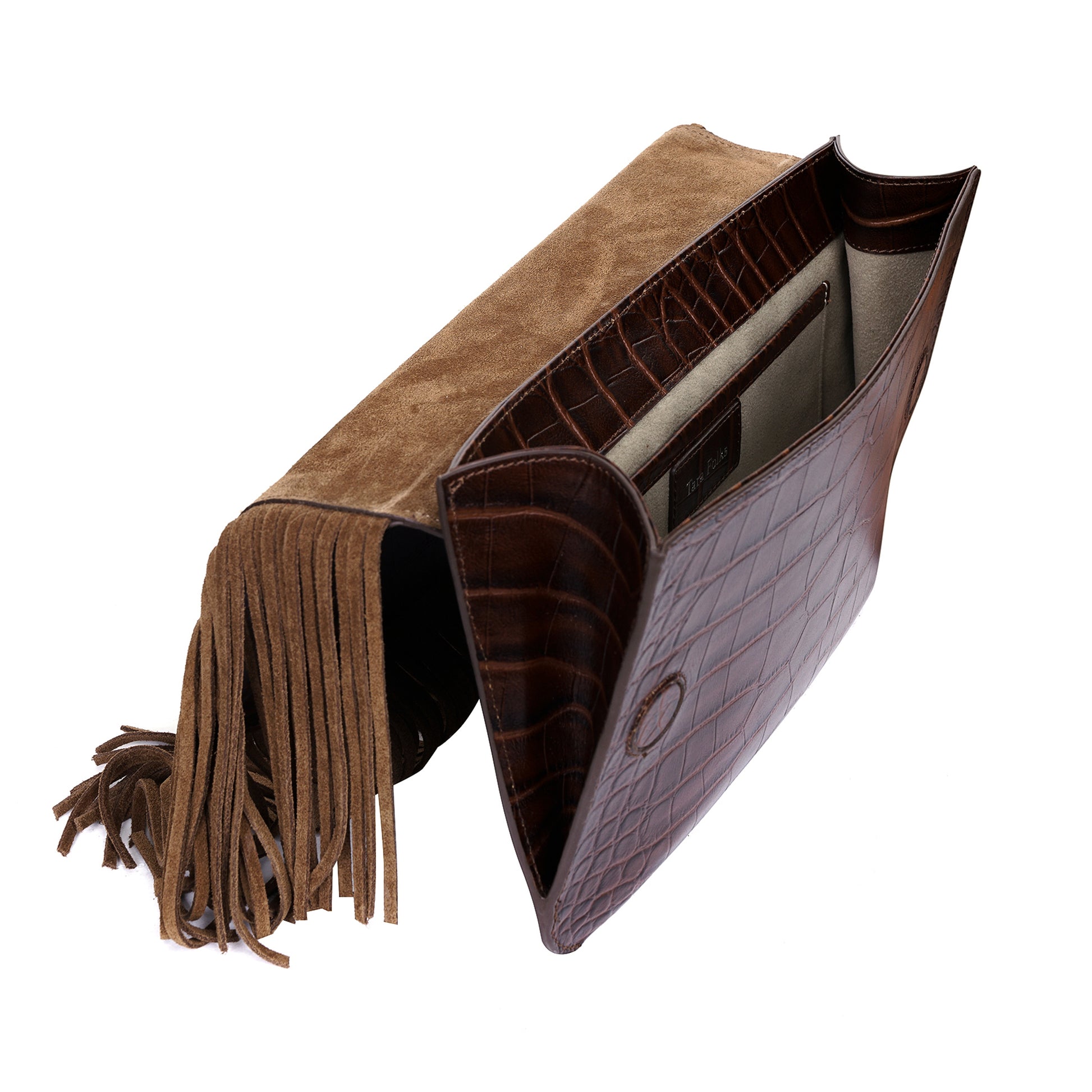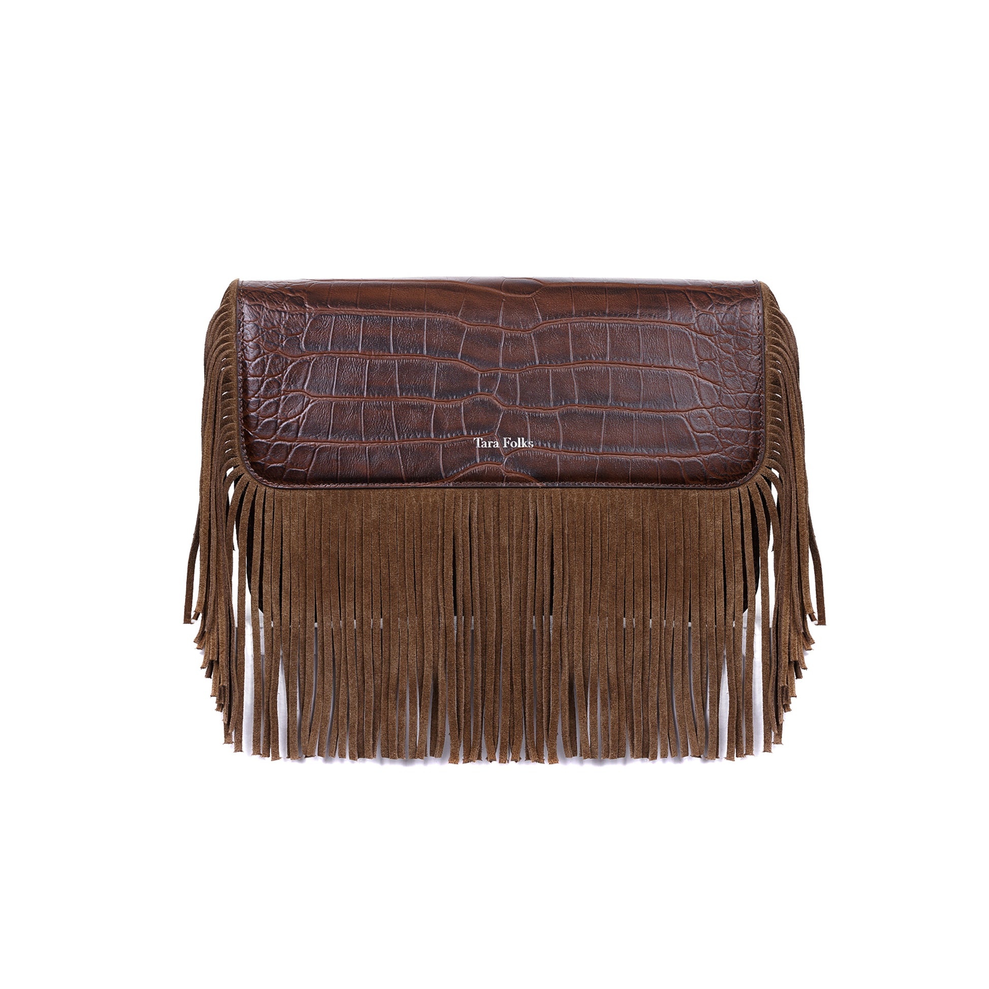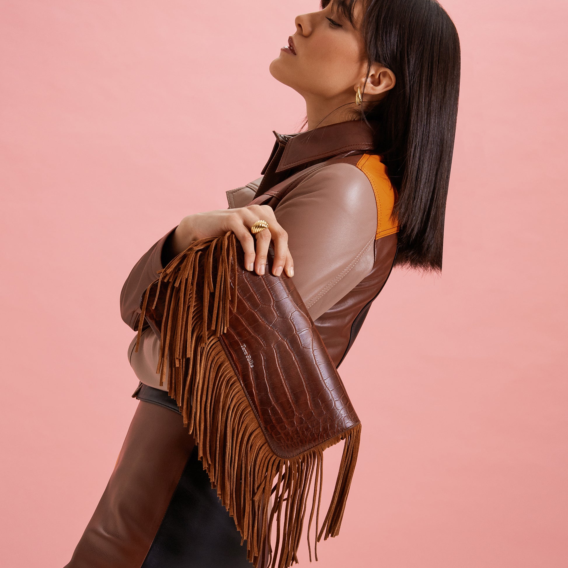 This statement bag blends luxury and playfulness, handcrafted in Istanbul from high-quality local leather in smooth or bold croco-embossed textures. Its sleek, rectangular shape is finished with flowing fringes, adding lively energy to your look. Designed to carry your essentials, it can be worn as a clutch or hands-free with a detachable, leather-studded shoulder strap.