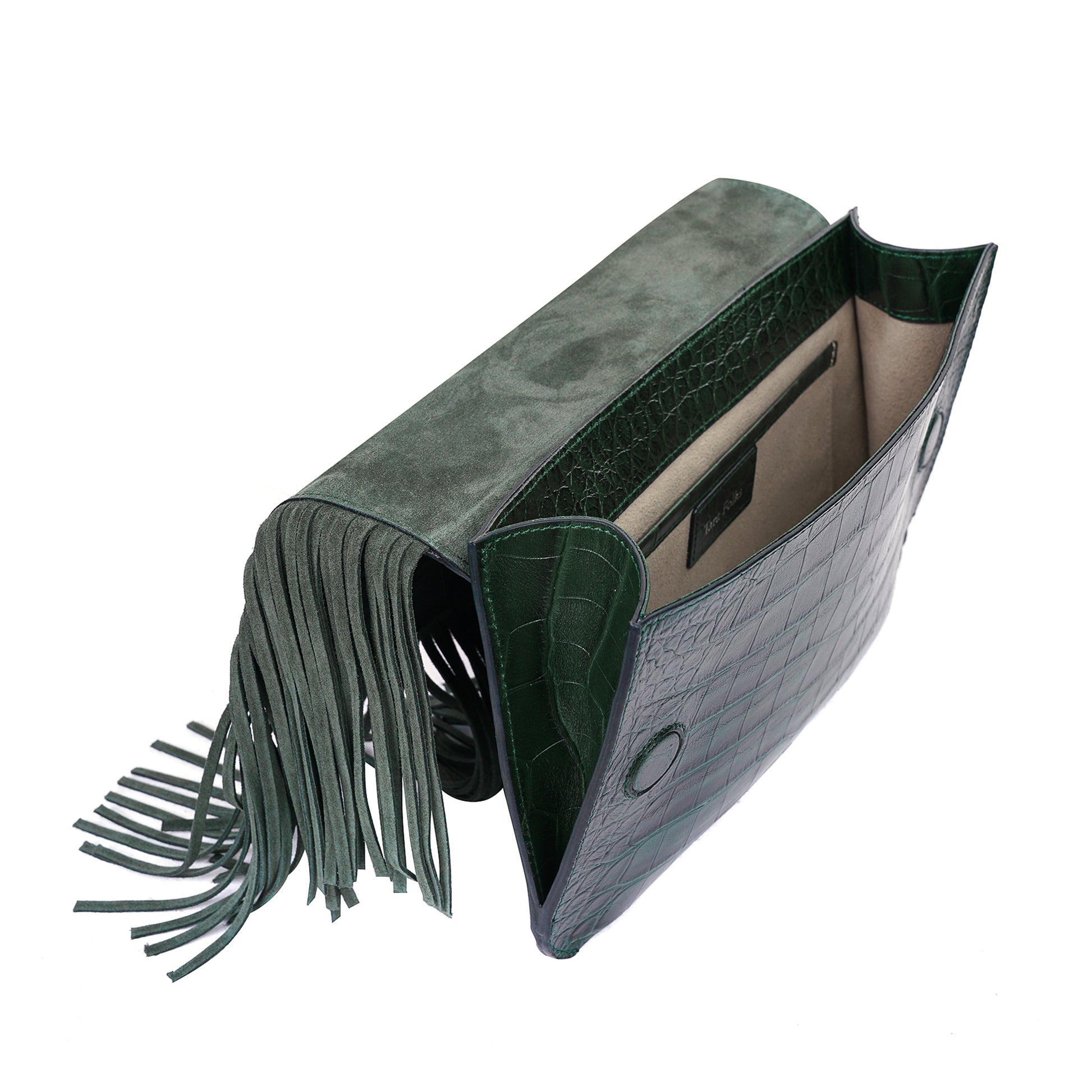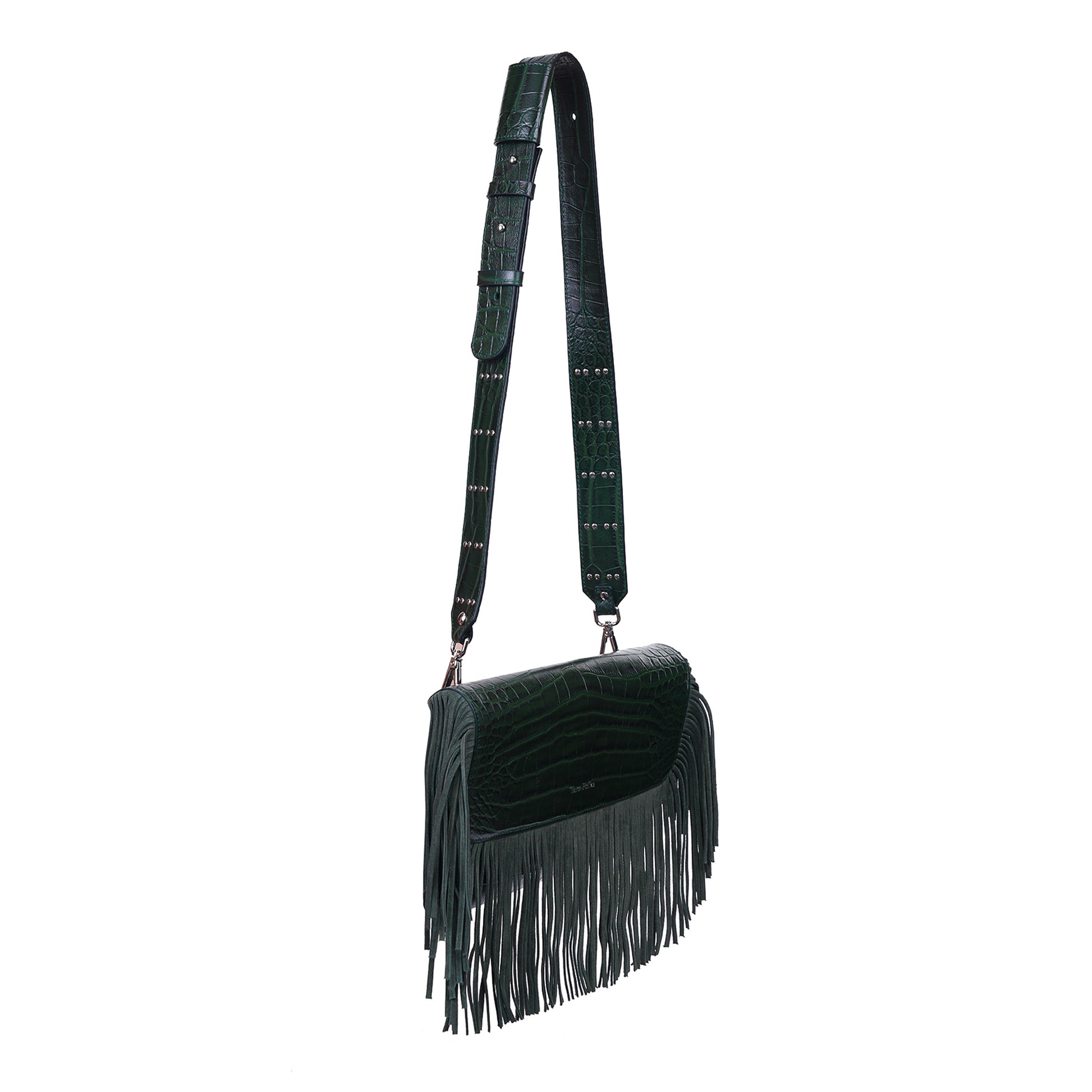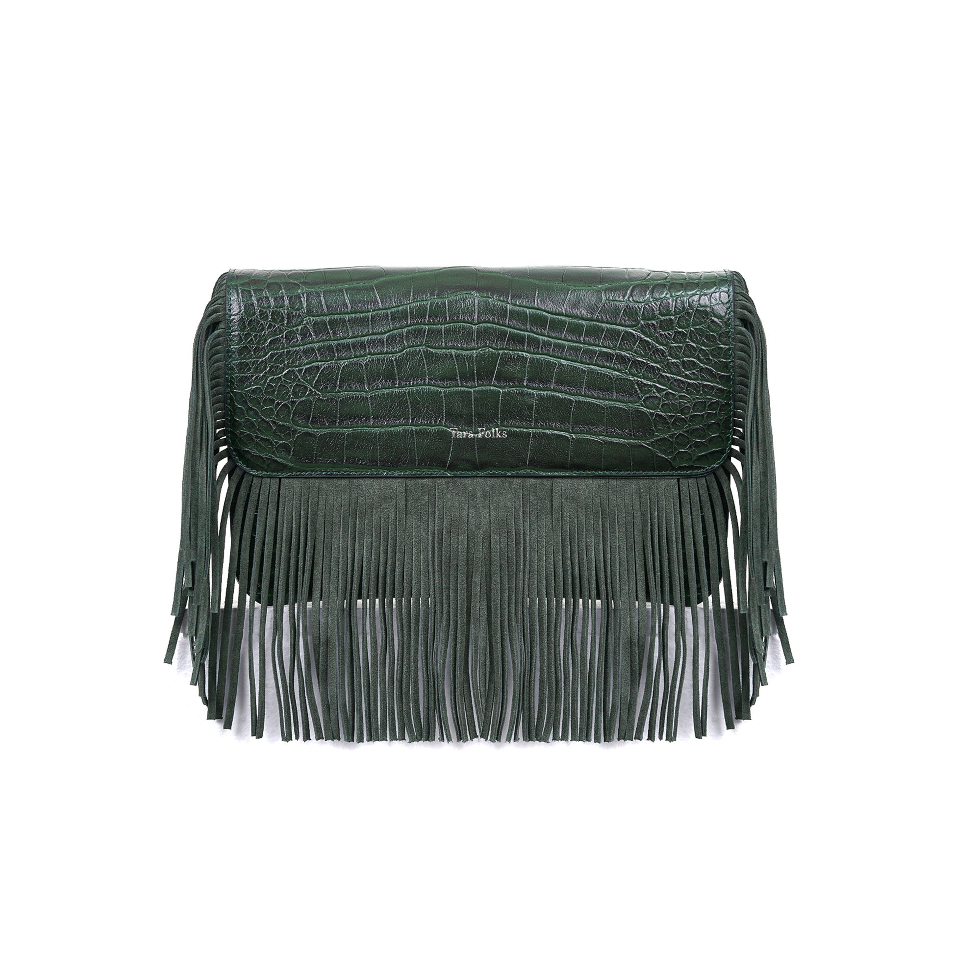 This statement bag blends luxury and playfulness, handcrafted in Istanbul from high-quality local leather in smooth or bold croco-embossed textures. Its sleek, rectangular shape is finished with flowing fringes, adding lively energy to your look. Designed to carry your essentials, it can be worn as a clutch or hands-free with a detachable, leather-studded shoulder strap.