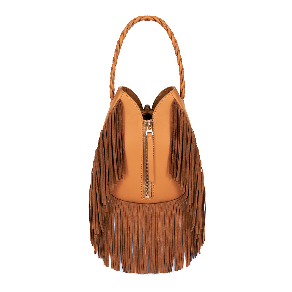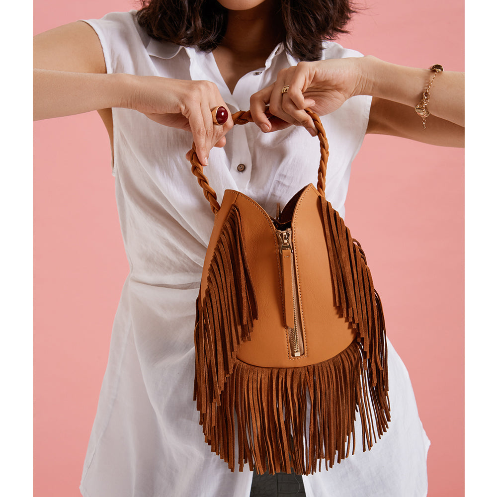 Tara Folks is devoted to quality craftsmanship - each design is handmade in Istanbul using carefully chosen materials. This 'Kate’ shoulder bag is made from tan genuine calf leather in a structured, tulip silhouette. It has a slim removable strap, so it's easy to wear as a shoulder bag or a wrist bag. Secured with a practical drawstring closure, gives enough room for your cell phone, cardholder and compact.