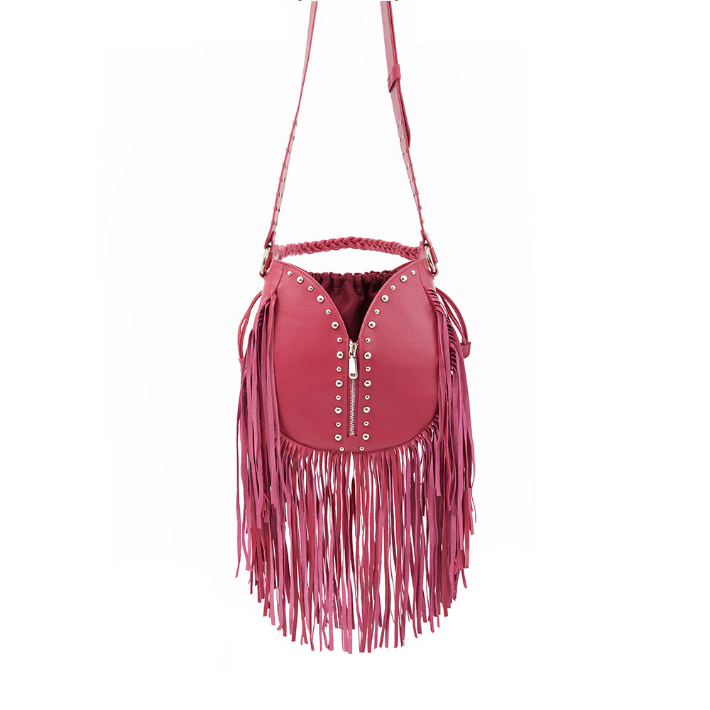 With smooth calf leather, eye-catching silver studs, and long tassels, this chic Western-style bag makes a statement. Carry it by the braided handle or long strap, and turn heads wherever you go!
