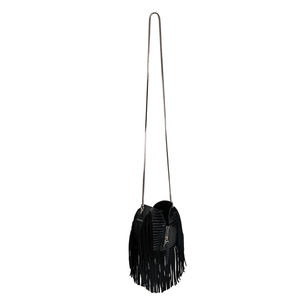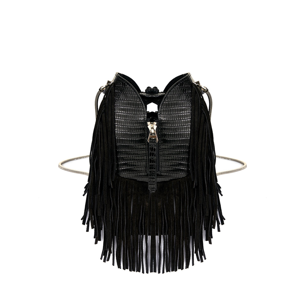 Crafted from high-quality, locally sourced leather and detailed with suede fringing for a playful touch, this tulip-shaped, structured design is paired with an elegant chain strap that gracefully drapes over your shoulder. Perfect for a night out, slip your cardholder and lipstick inside, and you're ready to turn heads with effortless style.