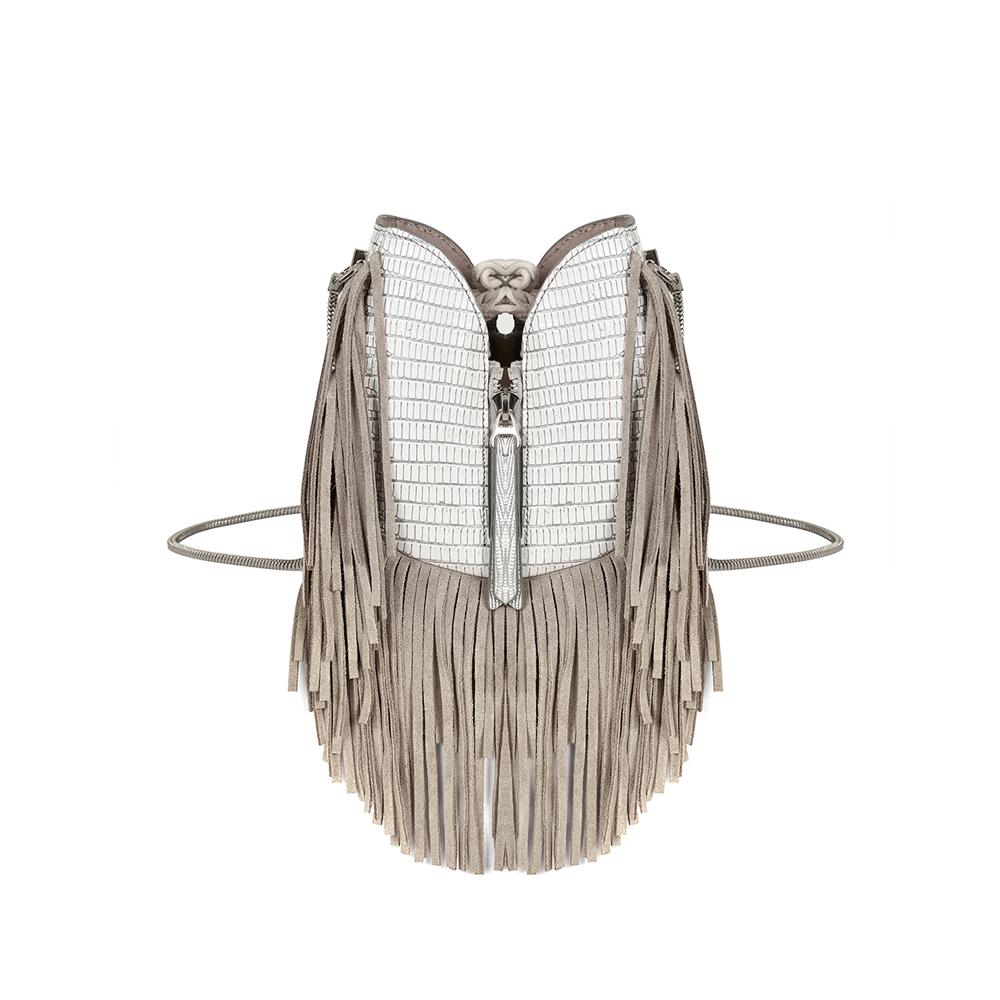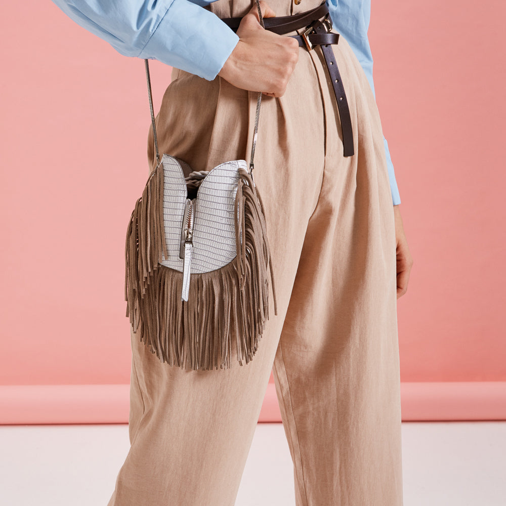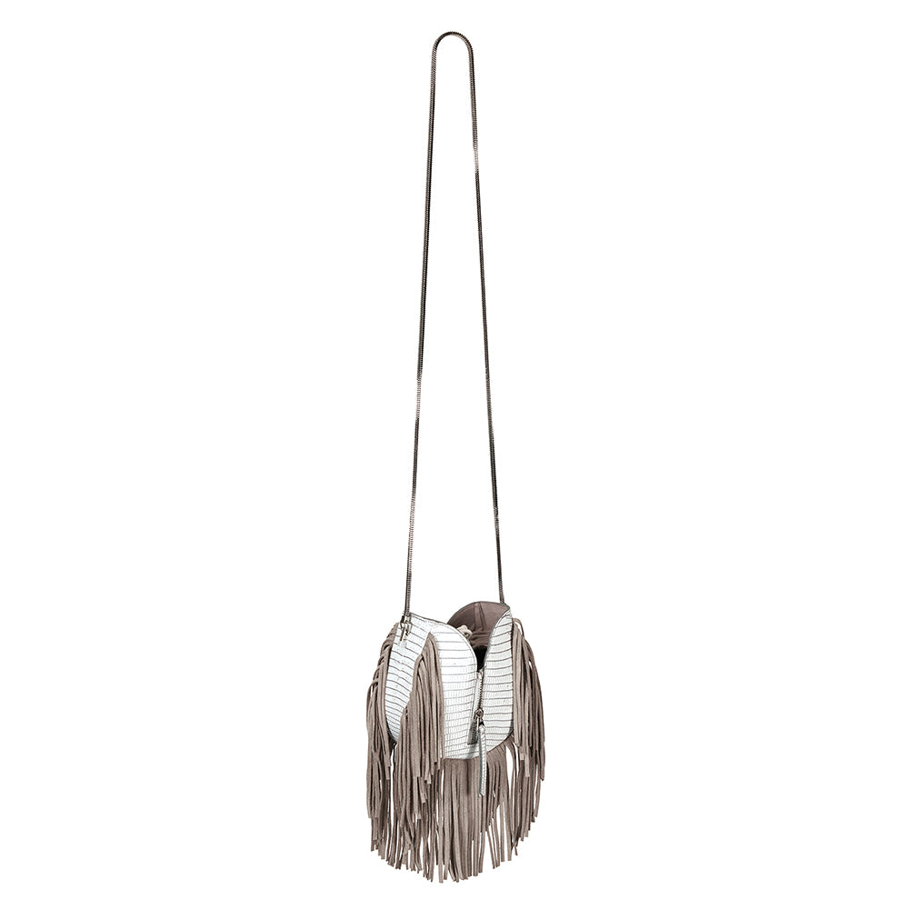 Crafted from high-quality, locally sourced leather and detailed with suede fringing for a playful touch, this tulip-shaped, structured design is paired with an elegant chain strap that gracefully drapes over your shoulder. Perfect for a night out, slip your cardholder and lipstick inside, and you're ready to turn heads with effortless style.