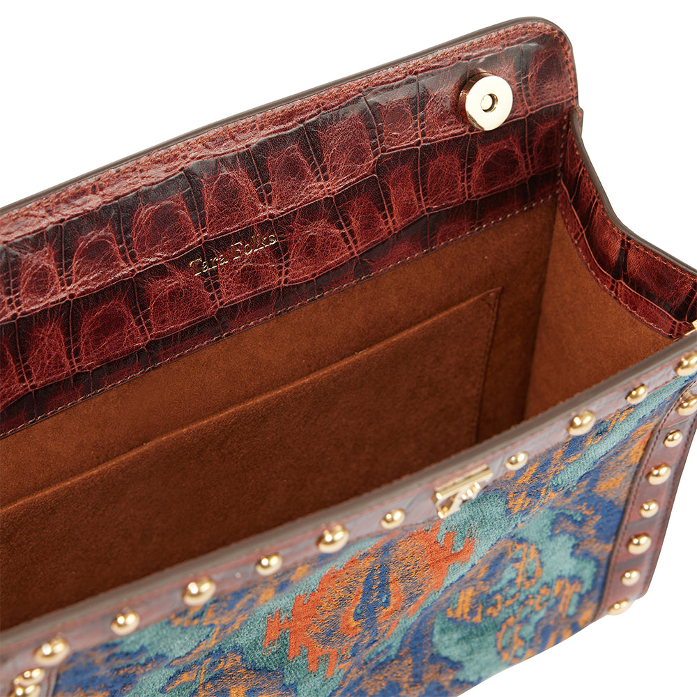 Crafted by skilled artisans, this standout clutch blends traditional Turkish fabrics with croc-embossed leather trims and golden studs, keeping your look effortlessly stylish from day to night!